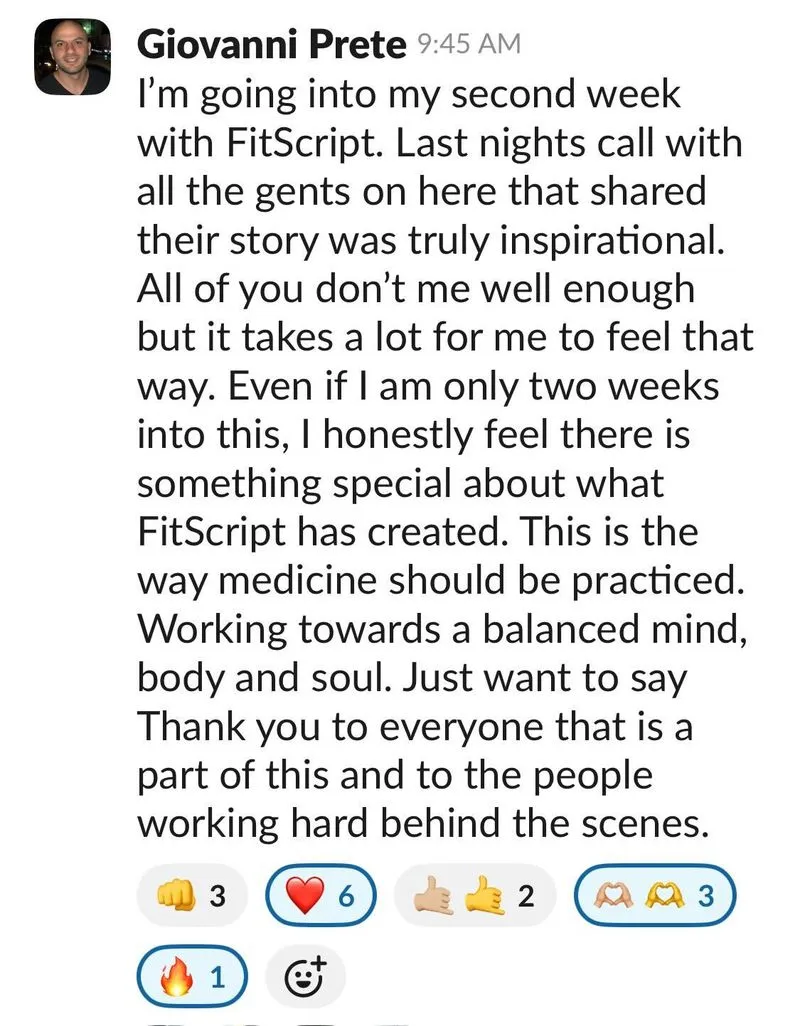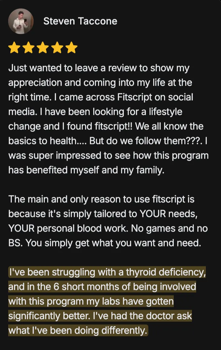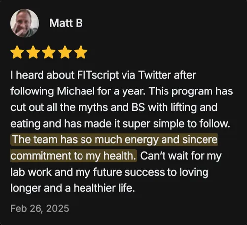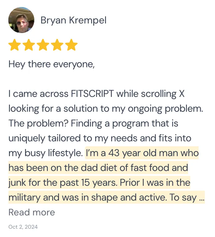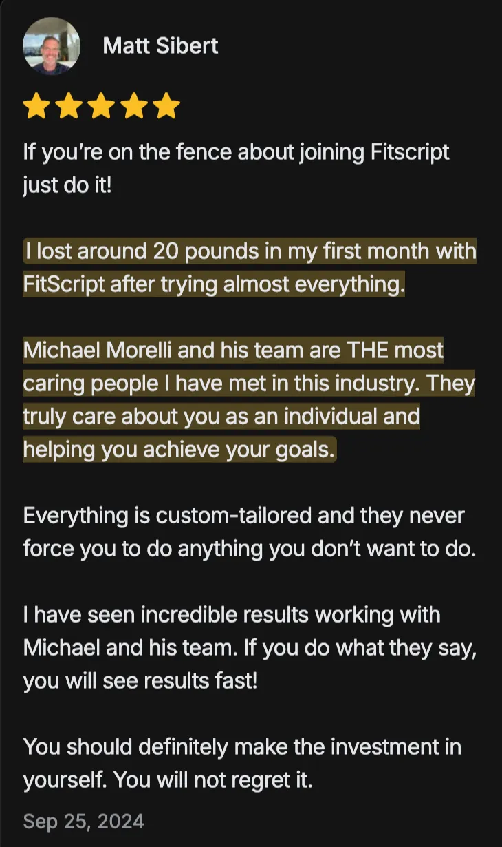 Everyone’s version of success looks different. But here’s what we know: the men who fully commit to the FitScript protocol who show up, follow the plan, and put in the work get life-changing results. Our system is built on data, not guesswork, and backed by a world-class team. We guarantee the roadmap, but you have to drive. Your outcome depends on your commitment.